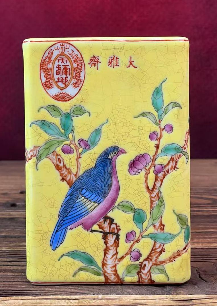 名称:清大雅斋黄地粉彩花鸟纹笔筒