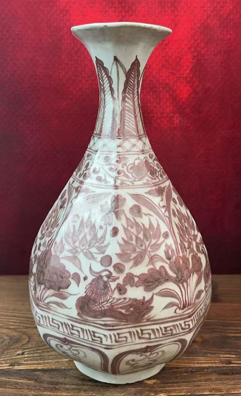 元釉里红鸳鸯戏莲纹玉壶春瓶