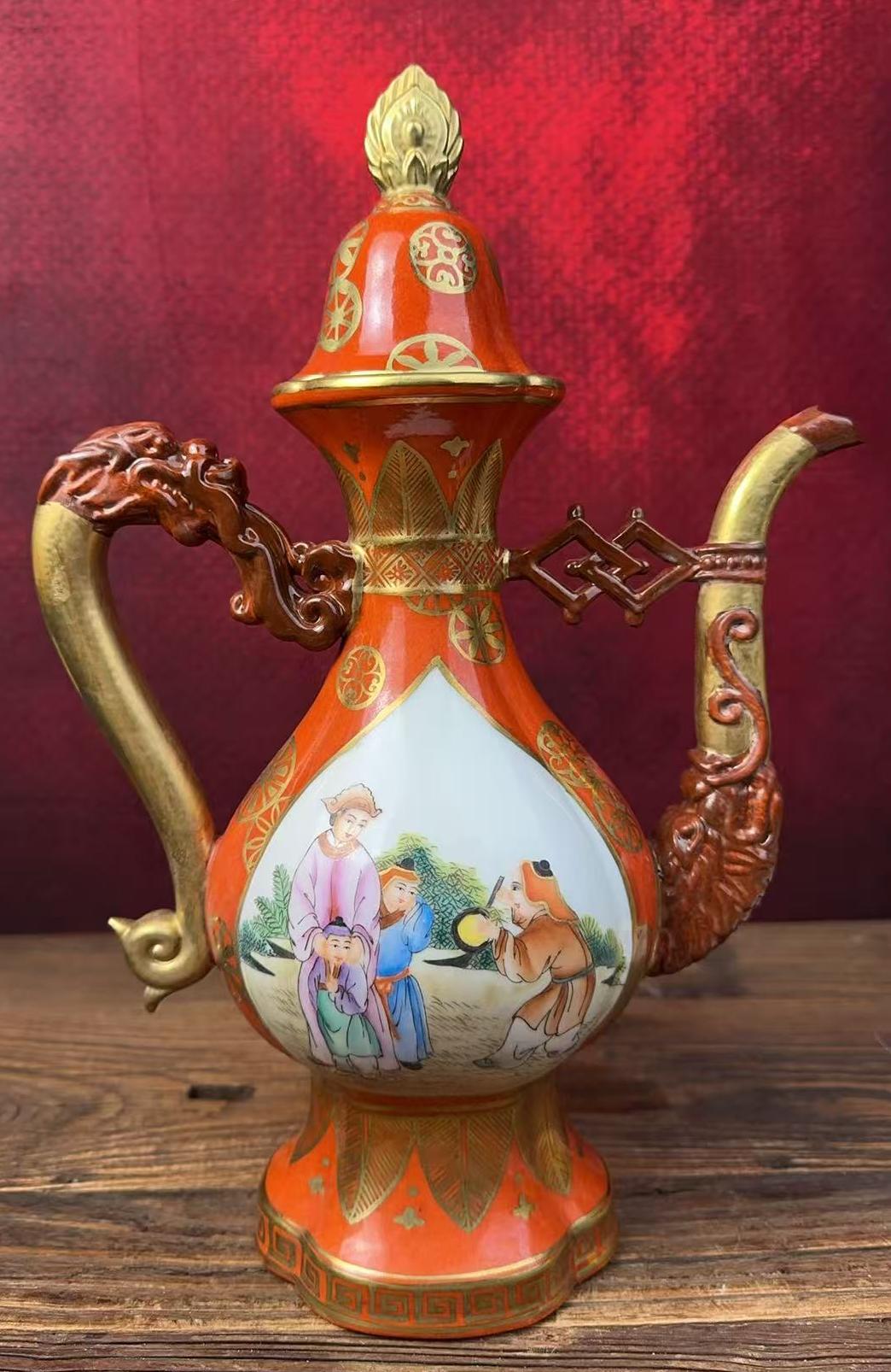 名称:清雍正珊瑚红地珐琅彩描金开窗人物纹龙柄执壶