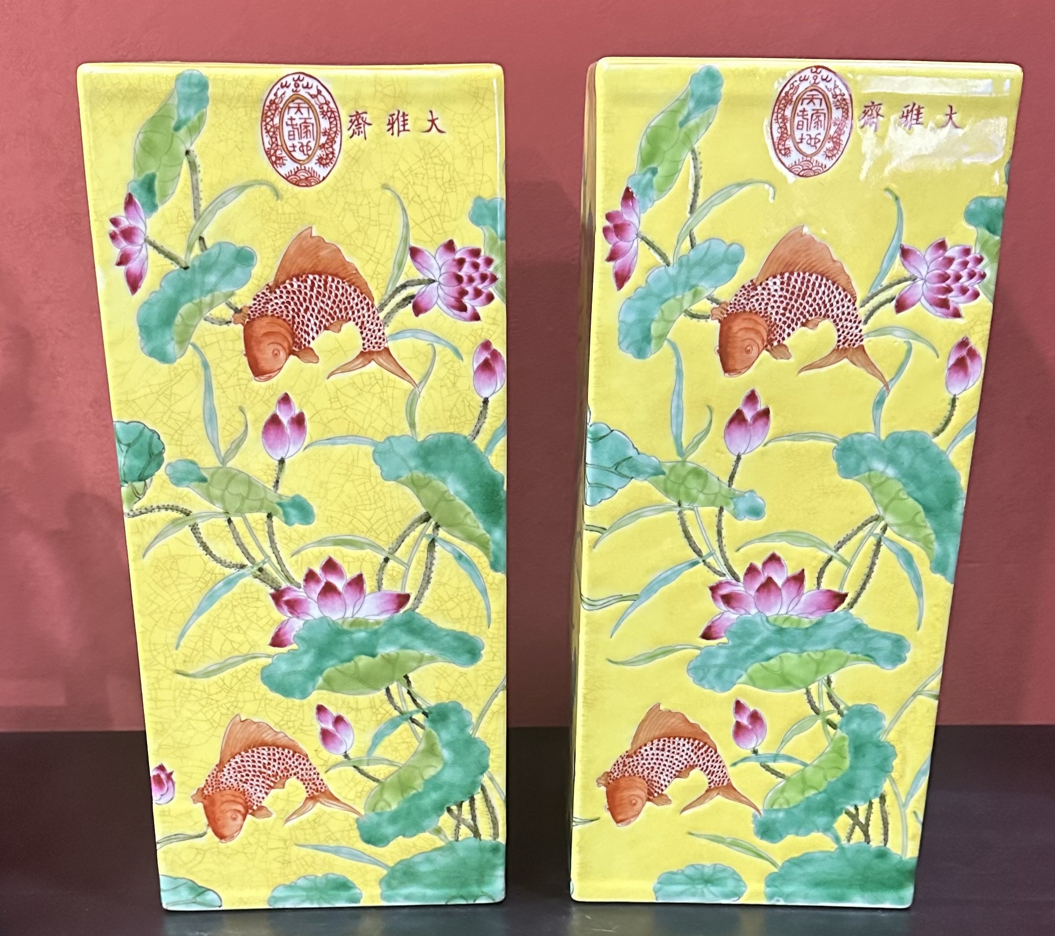 名称:清大雅斋黄地粉彩鱼戏莲纹四方瓶