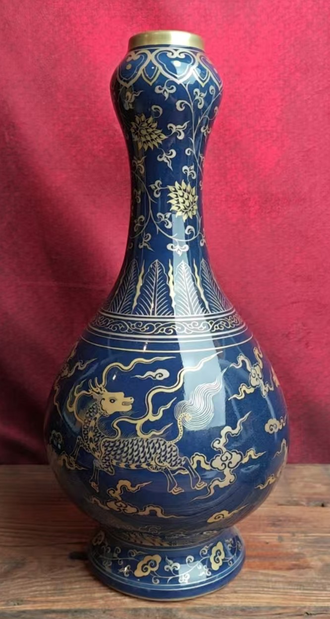 名称:明宣德霁蓝釉描金瑞兽纹蒜头瓶