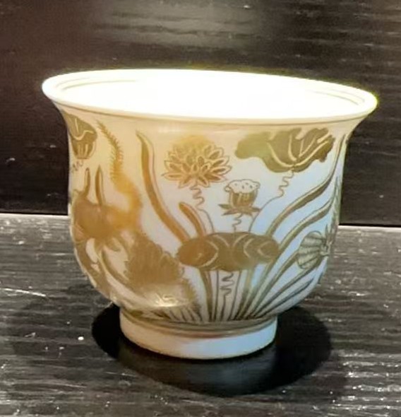明宣德白釉描金鱼藻纹杯