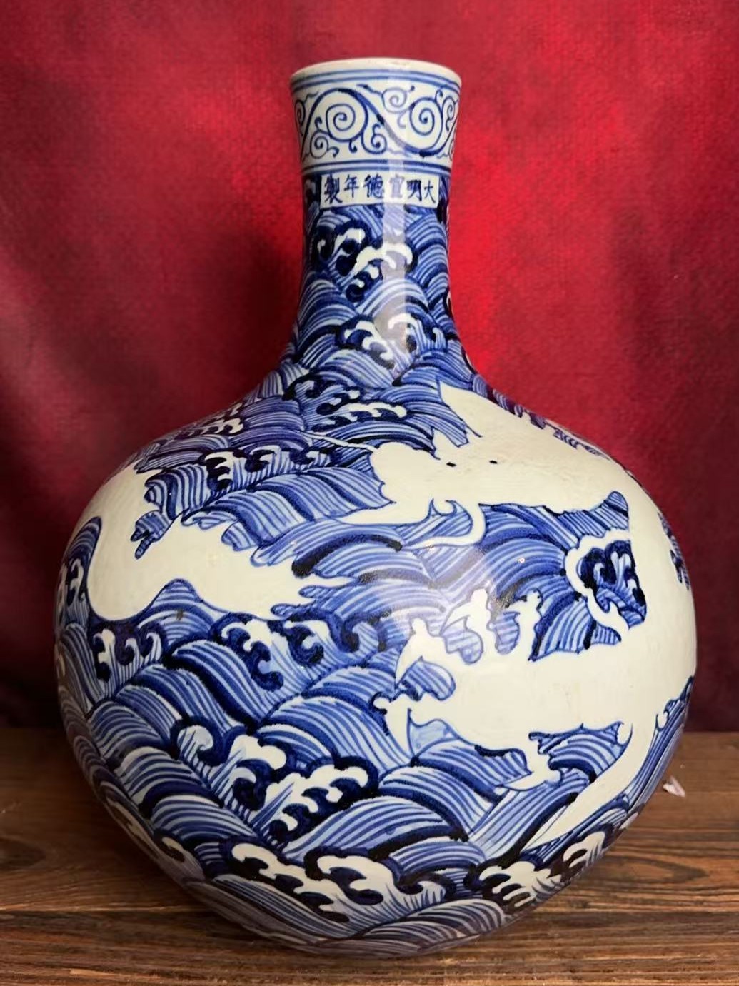 名称:明宣德青花留白海水龙纹天球瓶