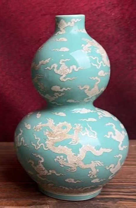 名称:明成化天蓝釉沥粉云龙纹葫芦瓶