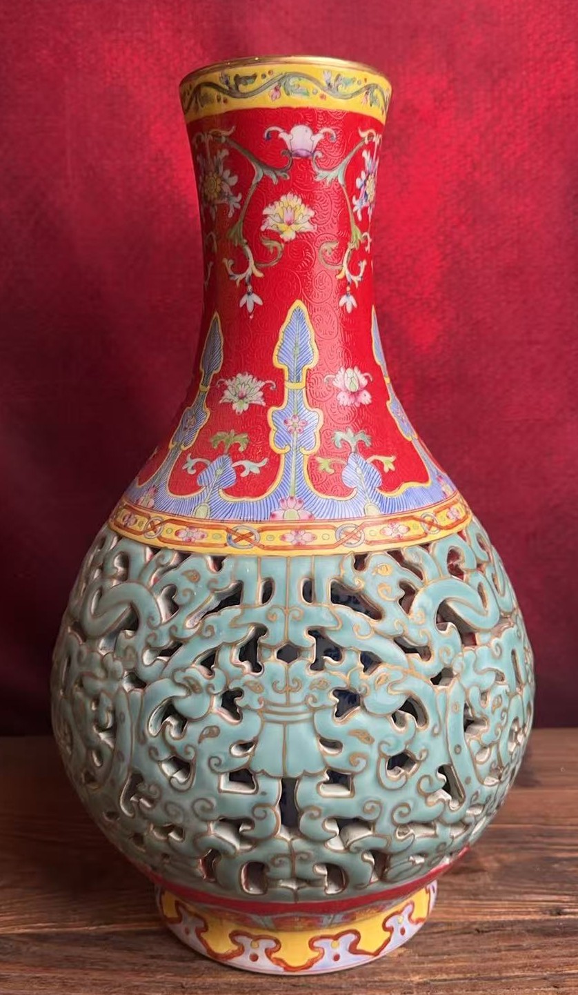 清乾隆轧道珐琅彩镂雕花卉纹直口瓶