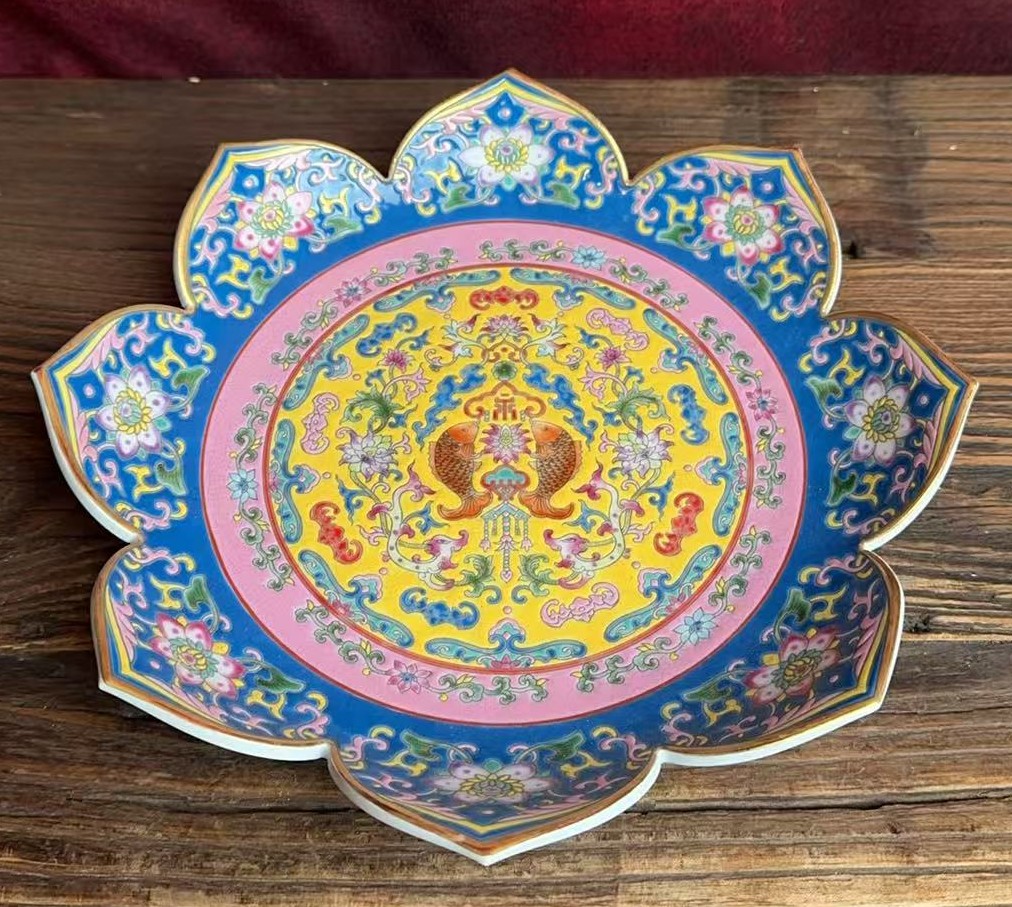 清雍正珐琅彩祝寿莲花双鱼纹花口盘