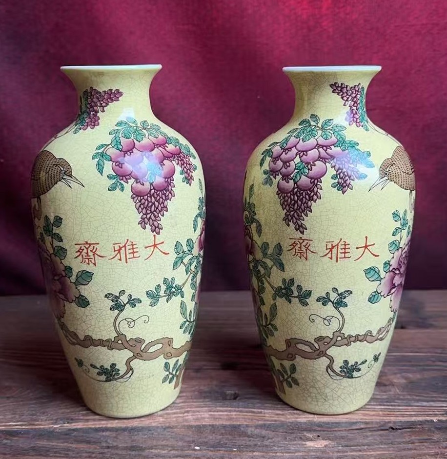名称:清大雅斋黄地粉彩花鸟纹瓶