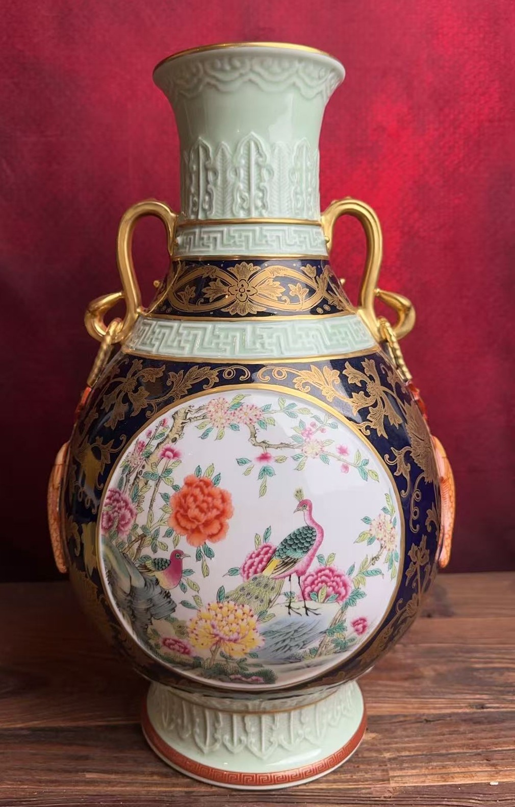 名称:清乾隆霁蓝釉描金开光粉彩花鸟纹双耳尊