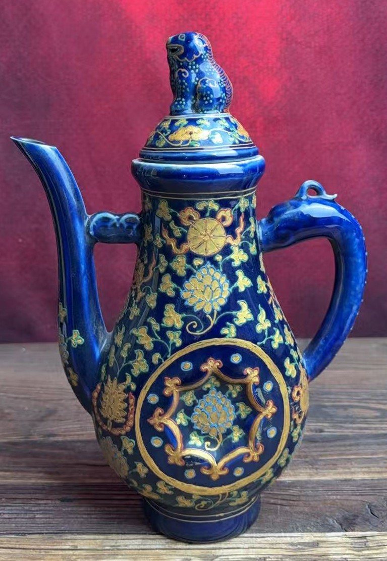 名称:明永乐霁蓝釉沥粉戗金花卉纹执壶