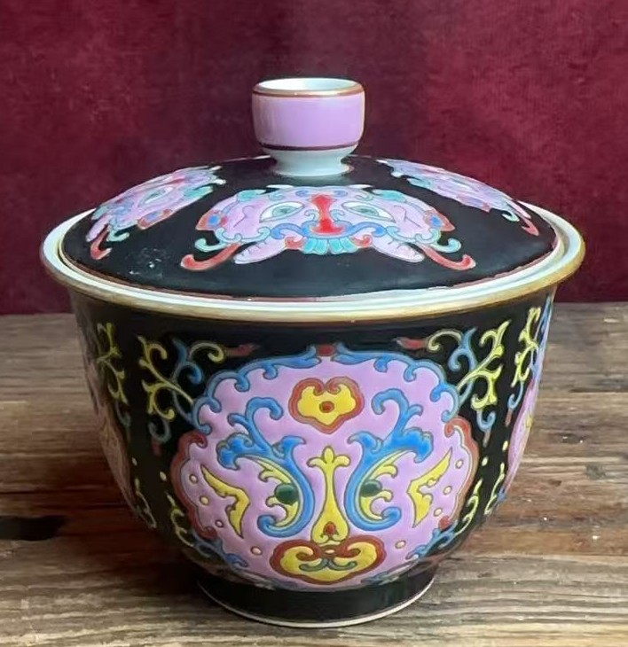 清雍正墨地珐琅彩瑞兽纹盖碗