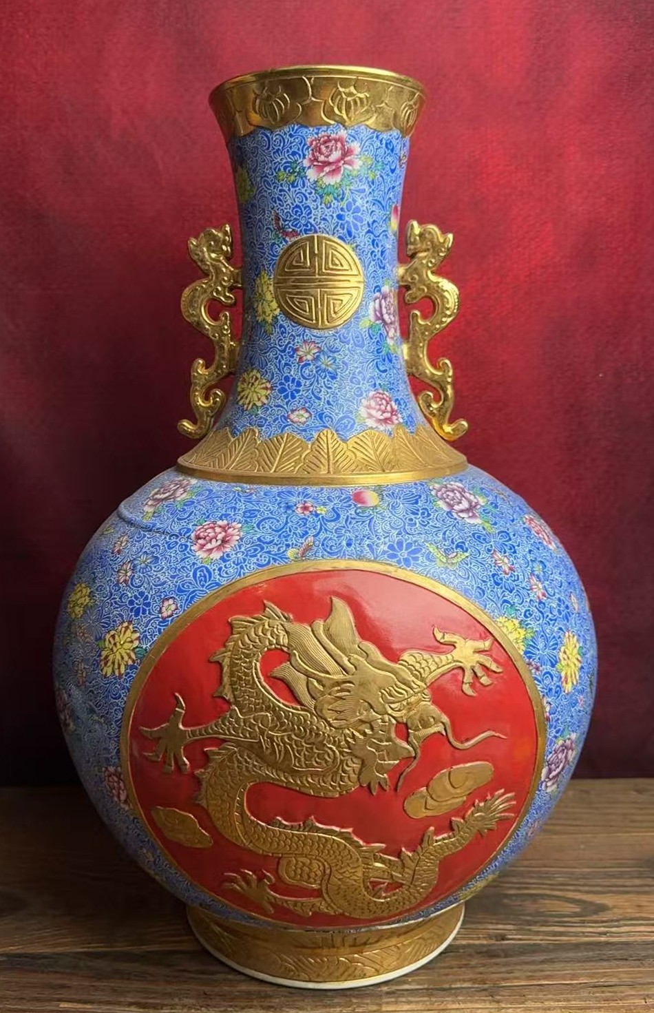 名称:清乾隆珐琅彩描金锦上添花浮雕龙纹天球瓶