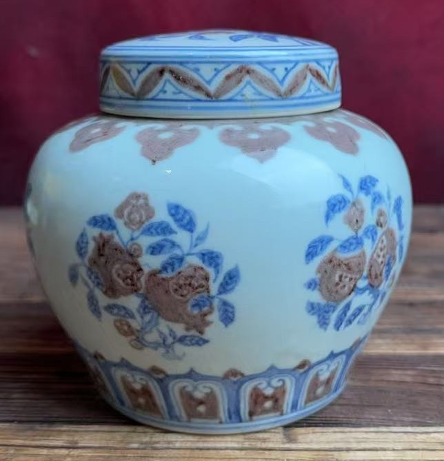 名称:明宣德青花釉里红瑞果纹盖罐