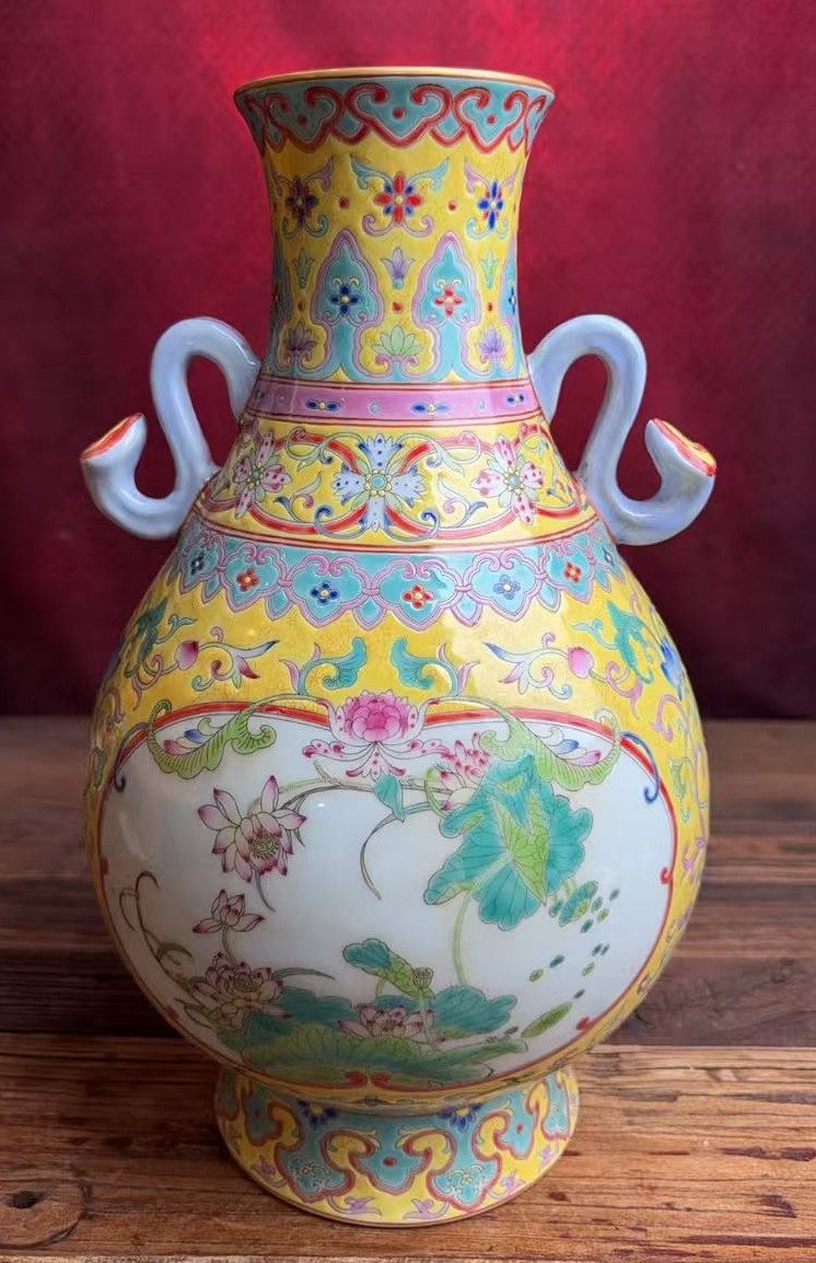 名称:清雍正珐琅彩开窗莲纹双耳瓶