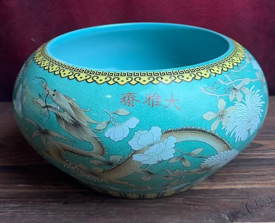 名称:清大雅斋松石绿地粉彩穿花龙纹卷缸