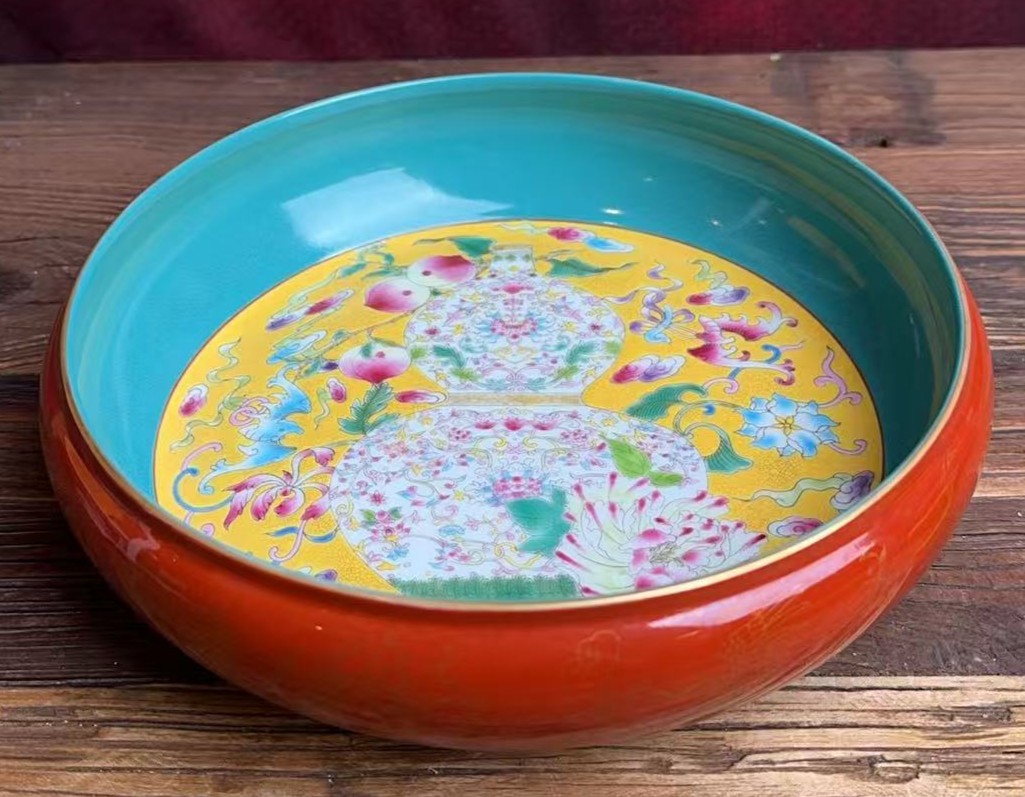 名称:清雍正外珊瑚红釉描金内珐琅彩福寿纹笔洗