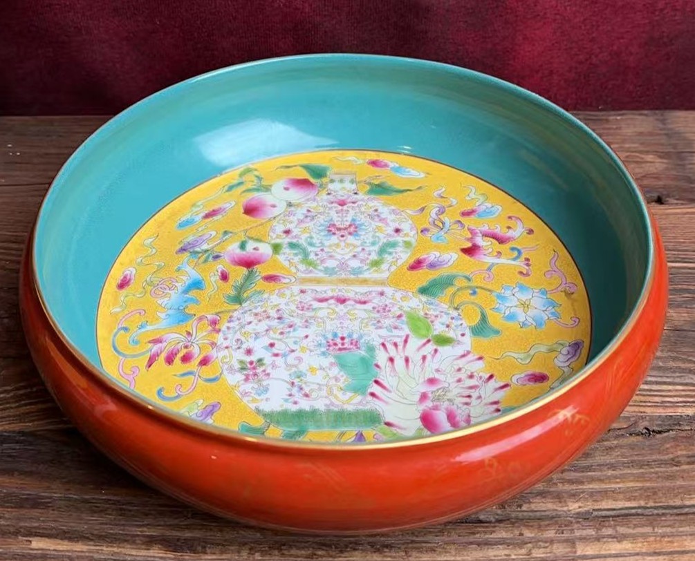 名称:清雍正外珊瑚红釉描金内珐琅彩福寿纹笔洗