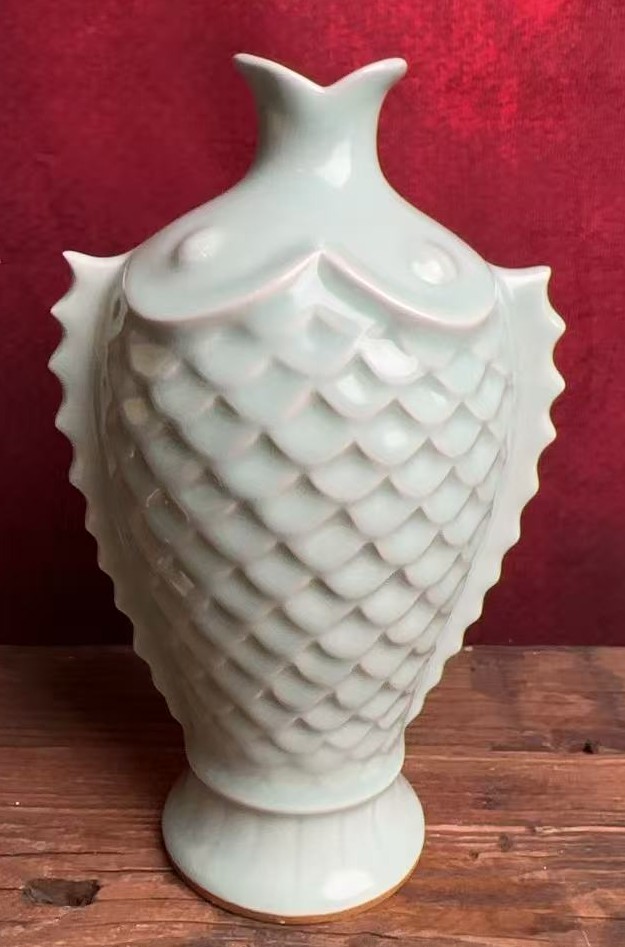 名称:清早期天青釉贴塑双鱼纹梅瓶