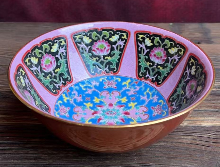 名称:清雍正外珊瑚红釉描金花鸟纹内珐琅彩开窗花卉纹宫碗