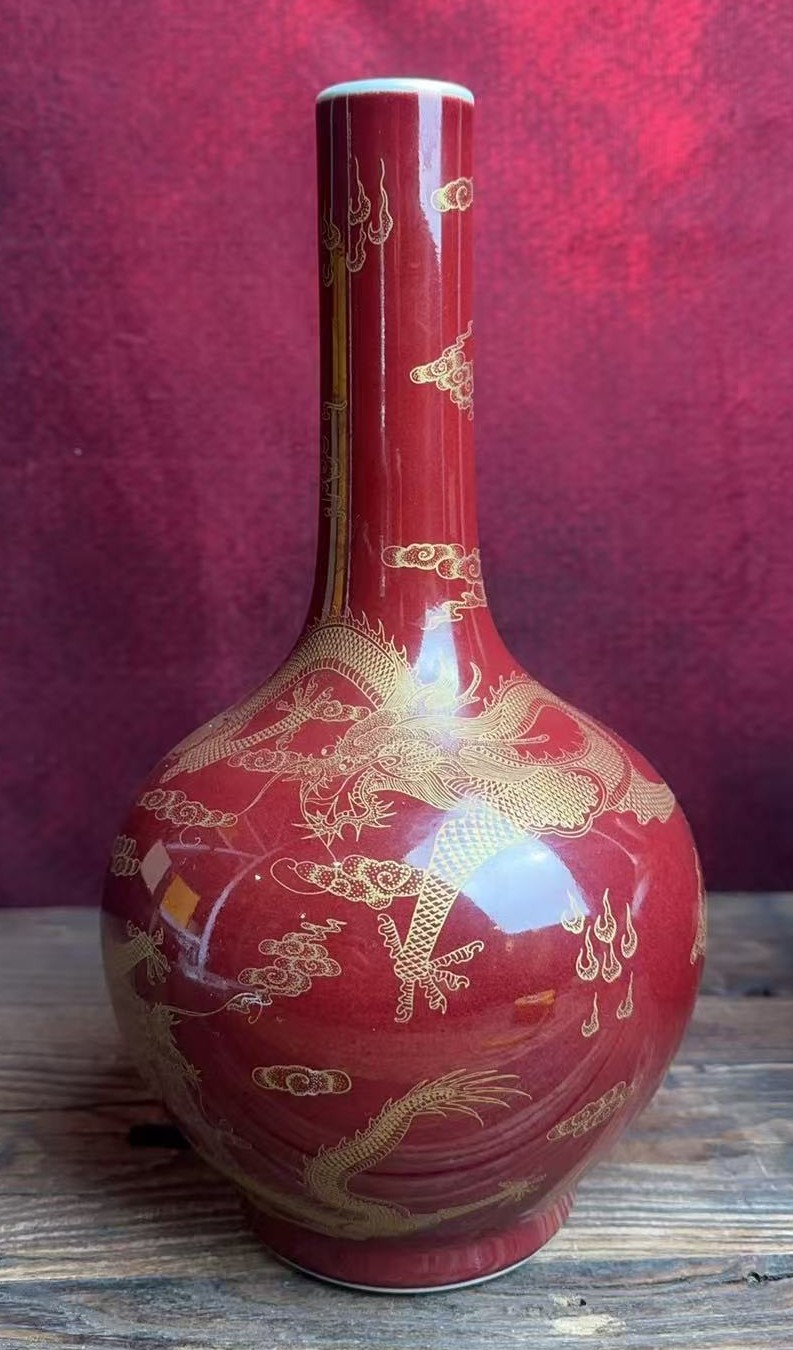 清乾隆郎红釉描金云龙纹长颈瓶