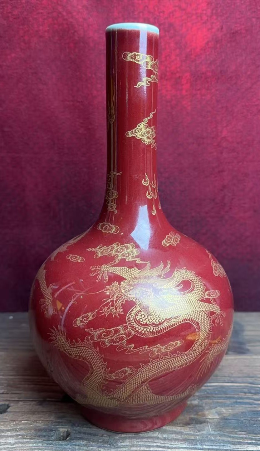 清乾隆郎红釉描金云龙纹长颈瓶