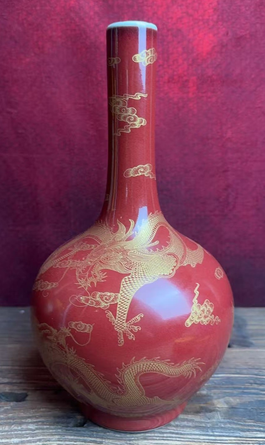 名称:清乾隆郎红釉描金云龙纹长颈瓶