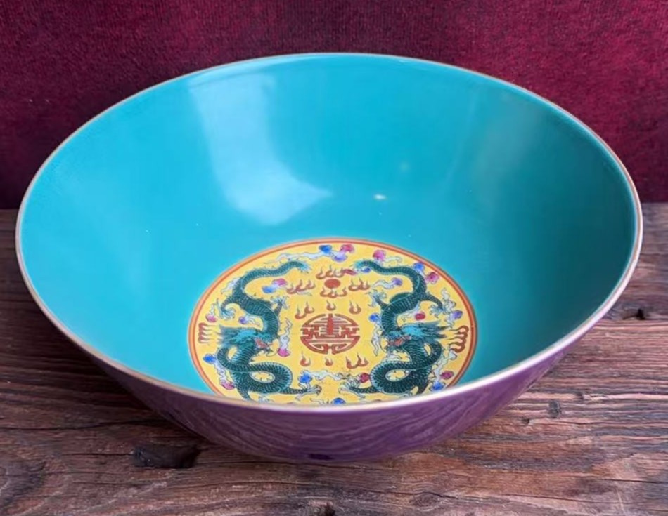 清雍正外胭脂紫釉内珐琅彩双龙捧寿纹碗