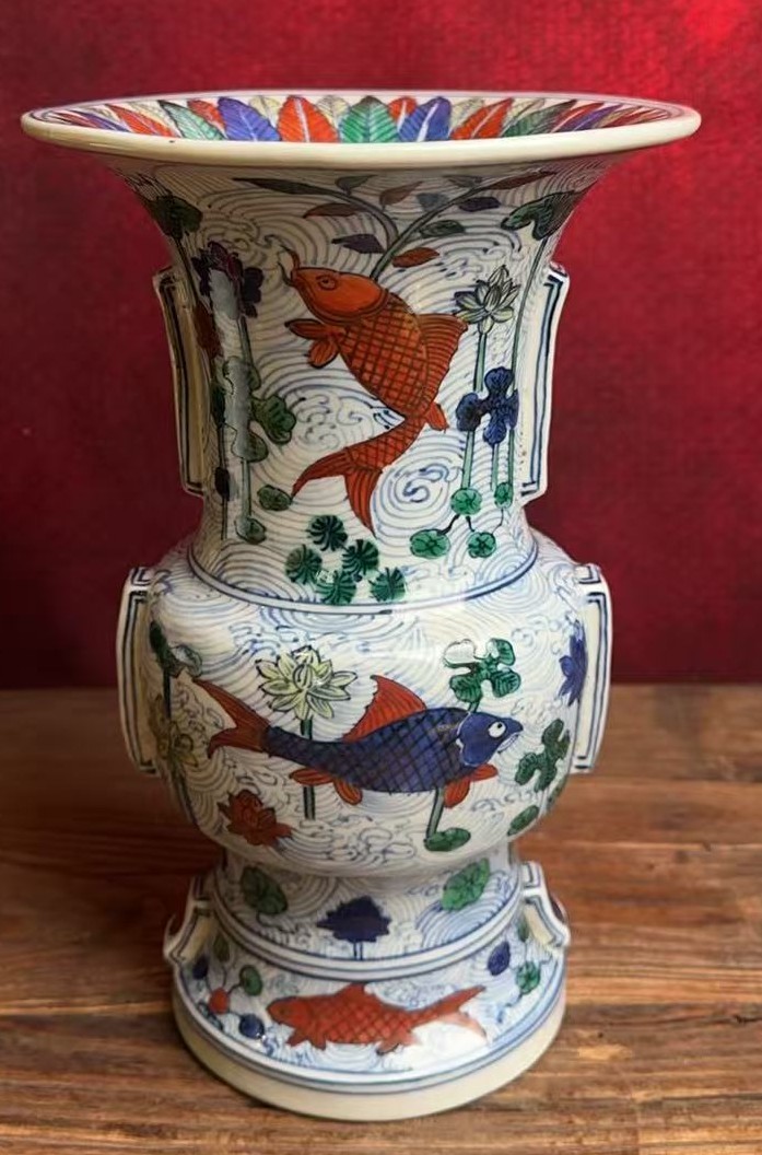 名称:明嘉靖青花五彩鱼戏莲纹出戟尊