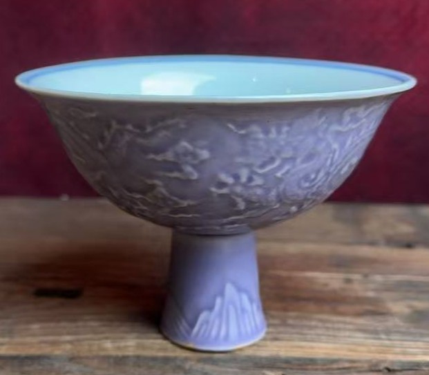 名称:明宣德紫釉暗刻云龙纹高足碗