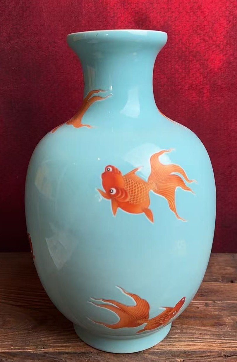 名称:清道光慎德堂款天青釉粉彩金玉满堂纹盘口瓶