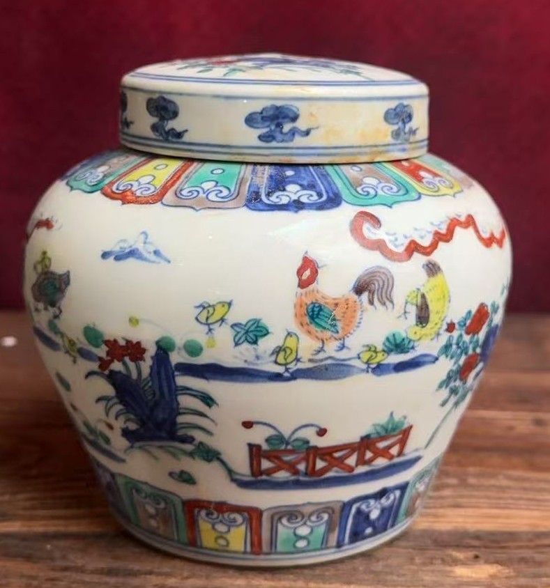 名称:明成化斗彩洞石锦鸡纹天字罐