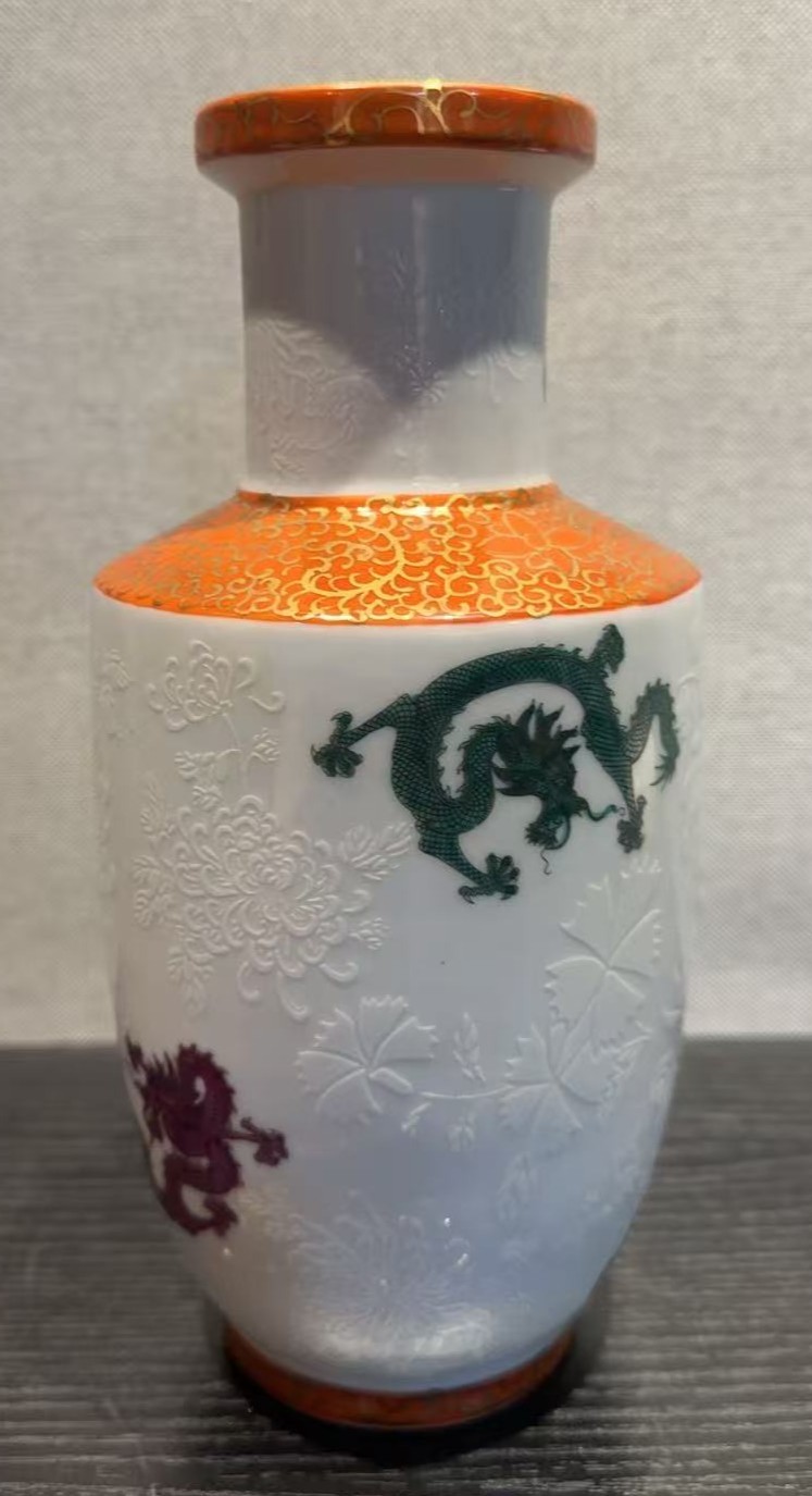 名称:清乾隆珐琅彩描金浮雕花卉龙纹棒槌瓶