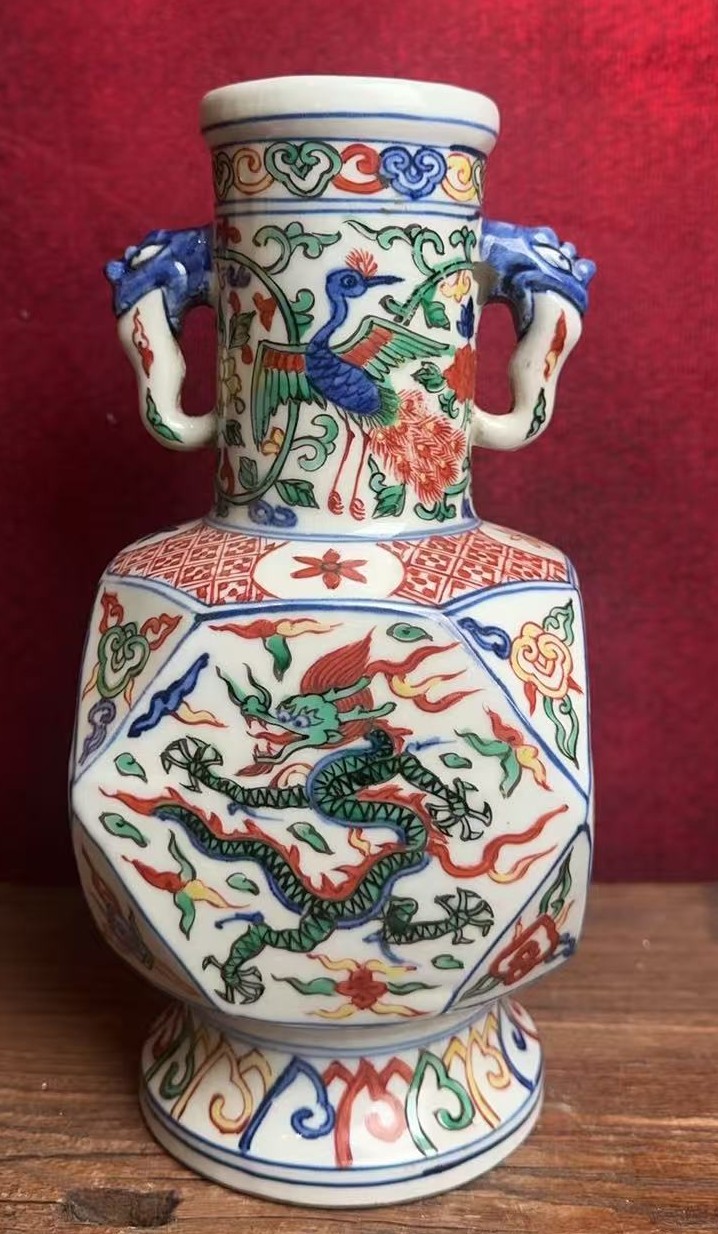 名称:明嘉靖青花五彩龙凤纹四方倭角尊