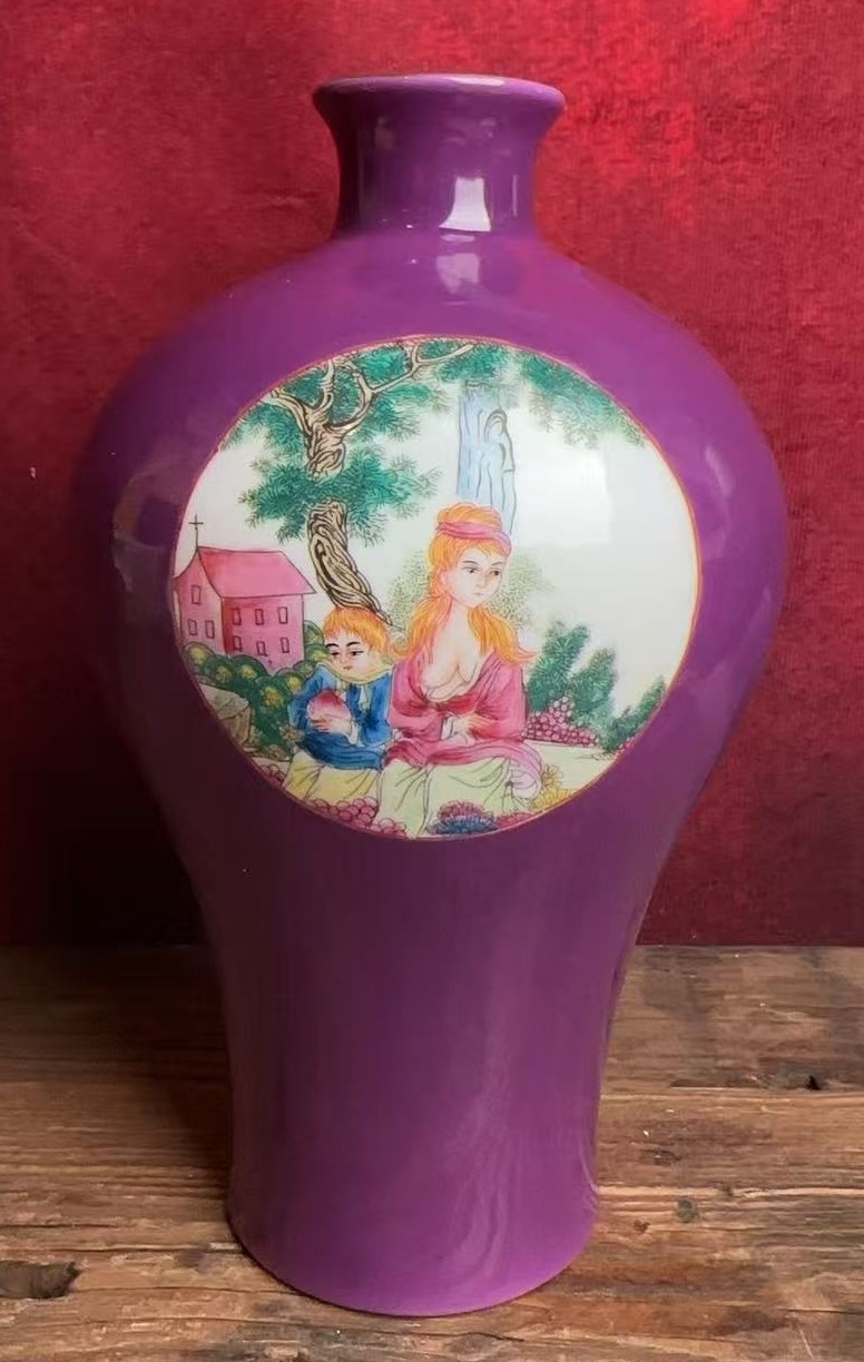 名称:清乾隆胭脂紫釉洋彩开窗西洋人物纹梅瓶