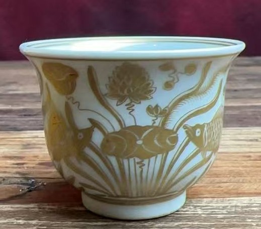 名称:明宣德描金彩鱼藻纹压手杯