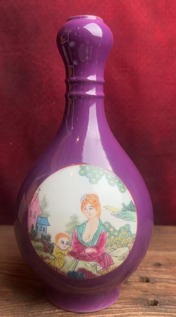 名称:清乾隆胭脂紫釉洋彩开窗西洋人物纹蒜头瓶