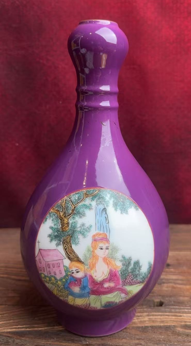 名称:清乾隆胭脂紫釉洋彩开窗西洋人物纹蒜头瓶