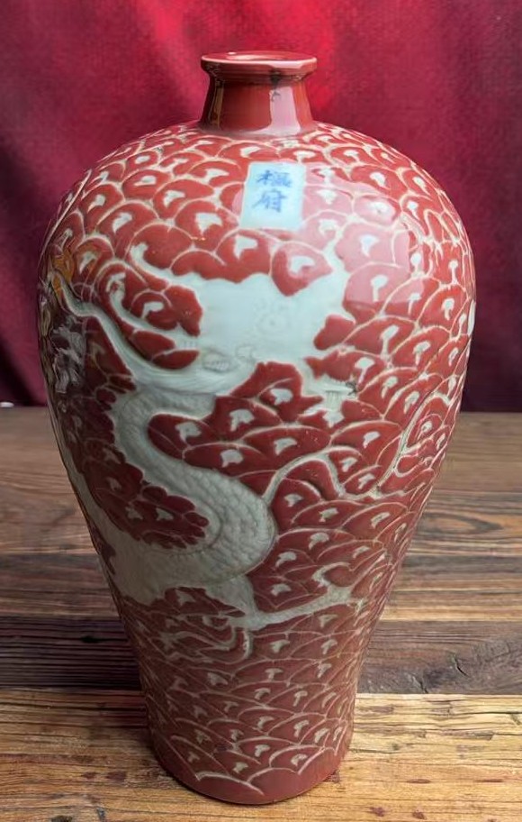名称:元红釉留白暗刻海水龙纹梅瓶