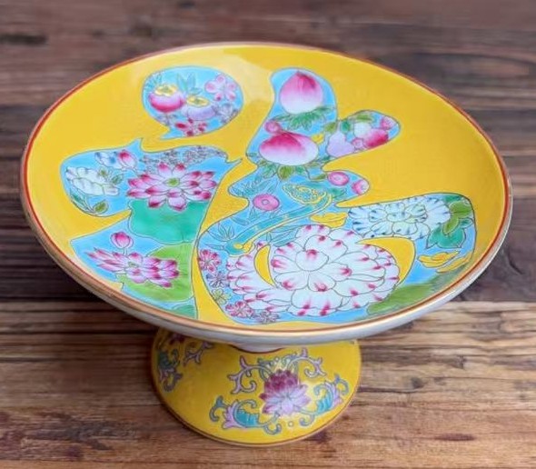 名称:清雍正黄地珐琅彩花卉福字纹高足盘