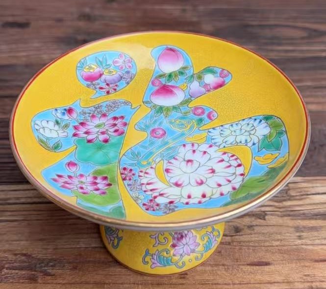 名称:清雍正黄地珐琅彩花卉福字纹高足盘