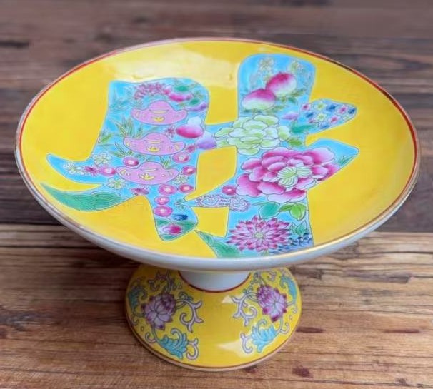 名称:清雍正黄地珐琅彩花卉财字纹高足盘