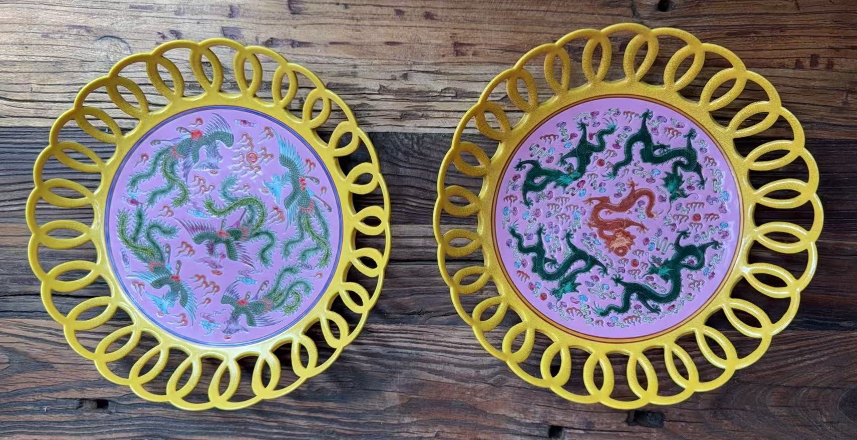 清雍正珐琅彩龙凤纹镂雕花边对盘