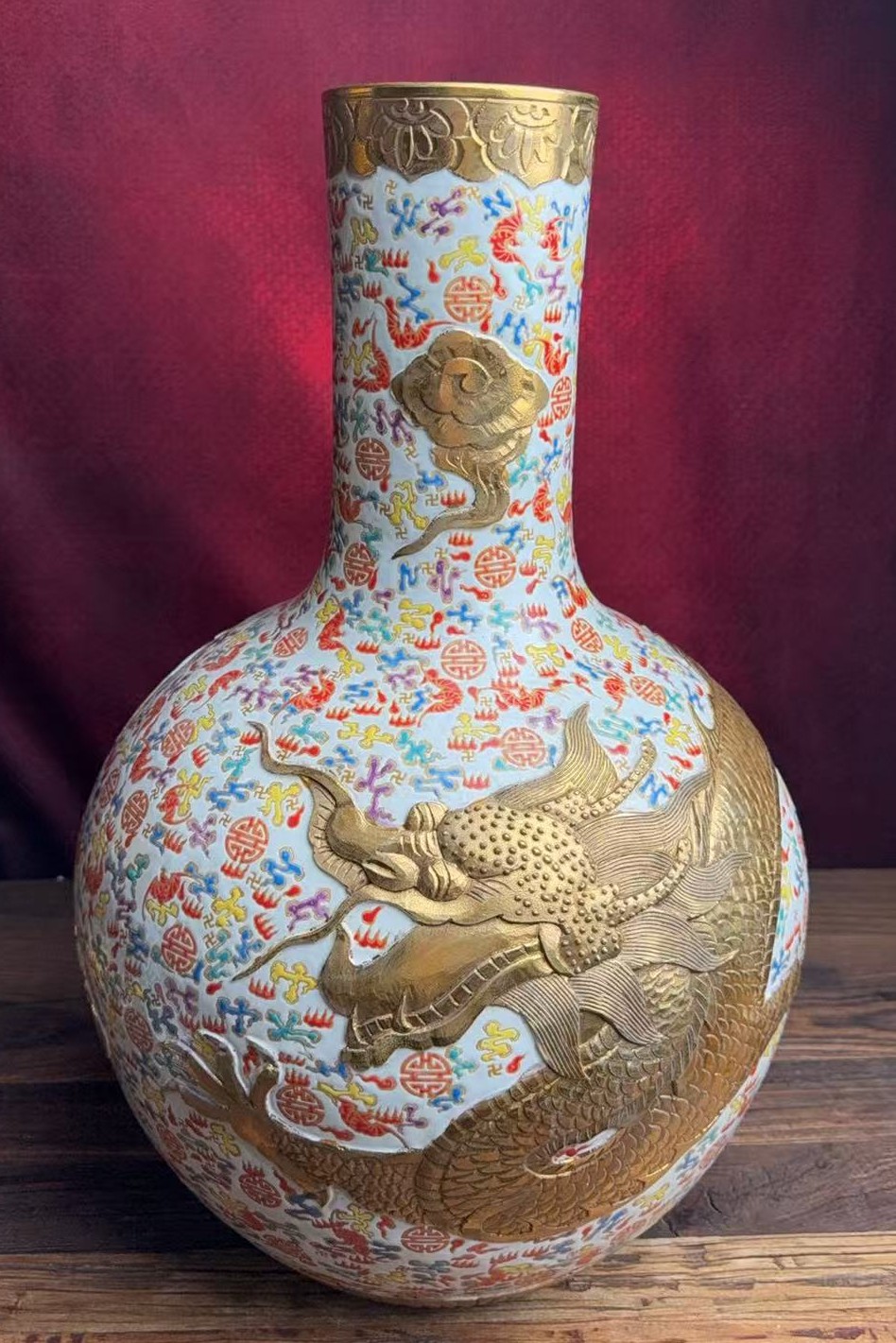 名称:清乾隆珐琅彩描金浮雕云龙纹天球瓶