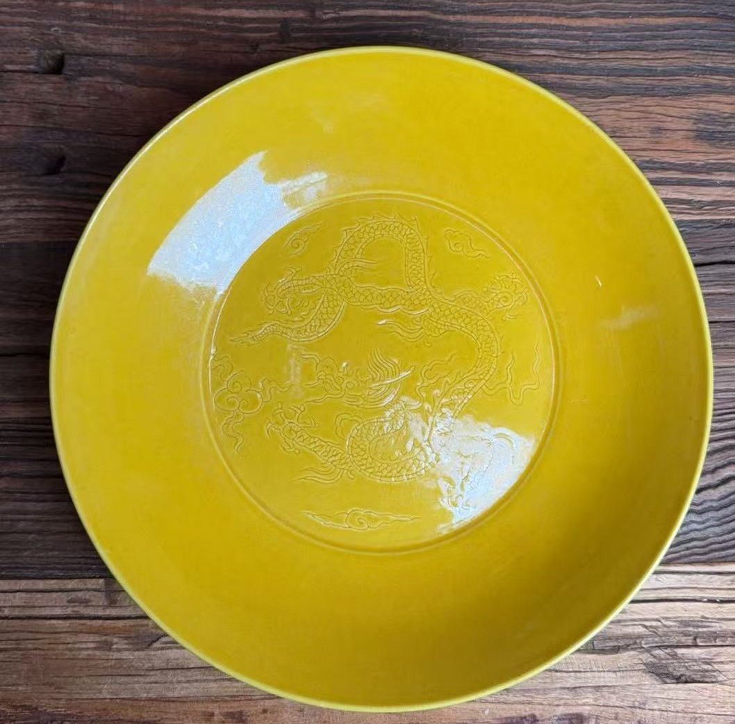 名称:明成化黄釉暗刻云龙纹盘