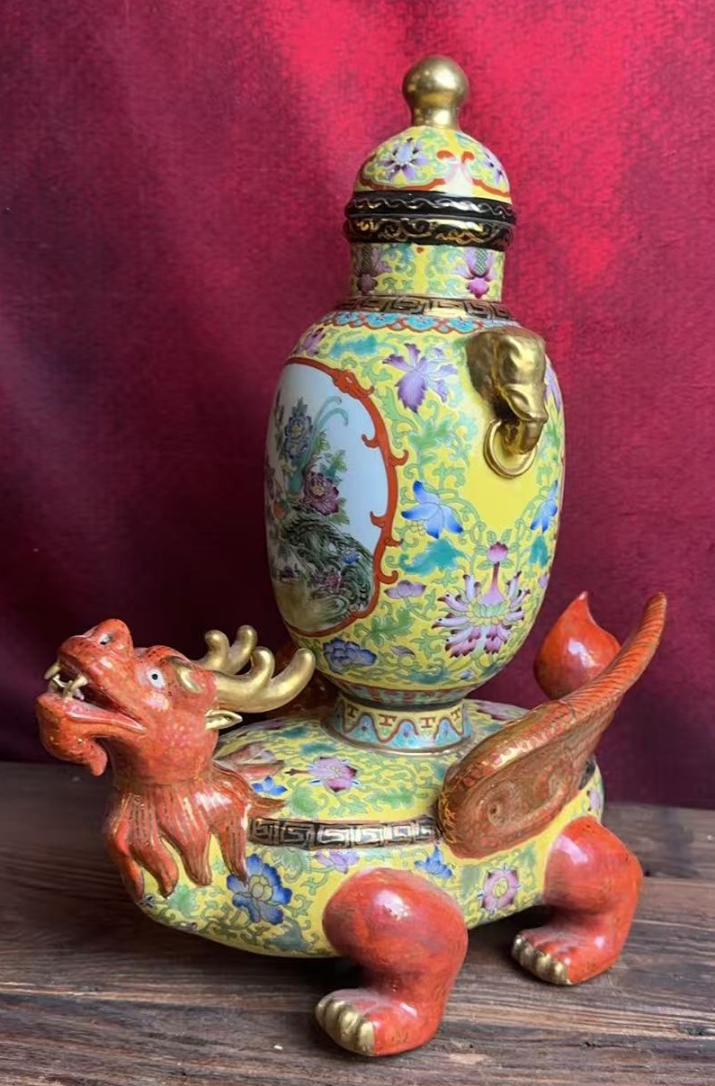 清乾隆珐琅彩龙龟开窗花鸟纹双耳瓶