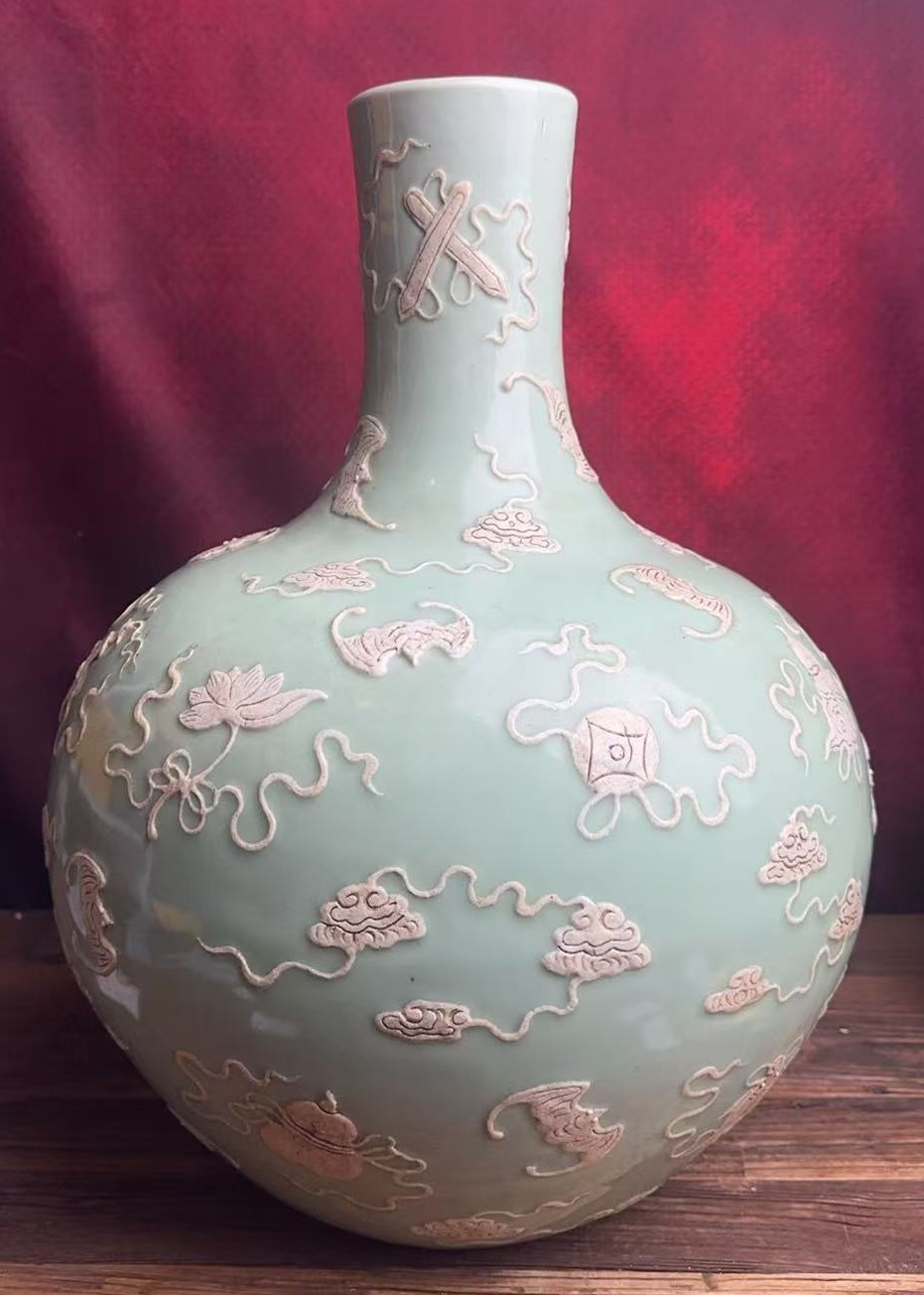 名称:清乾隆天青釉沥粉暗八仙纹天球瓶