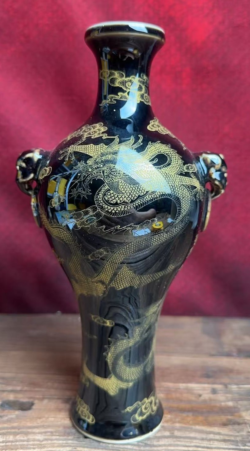 名称:清乾隆墨地描金云龙纹双耳瓶