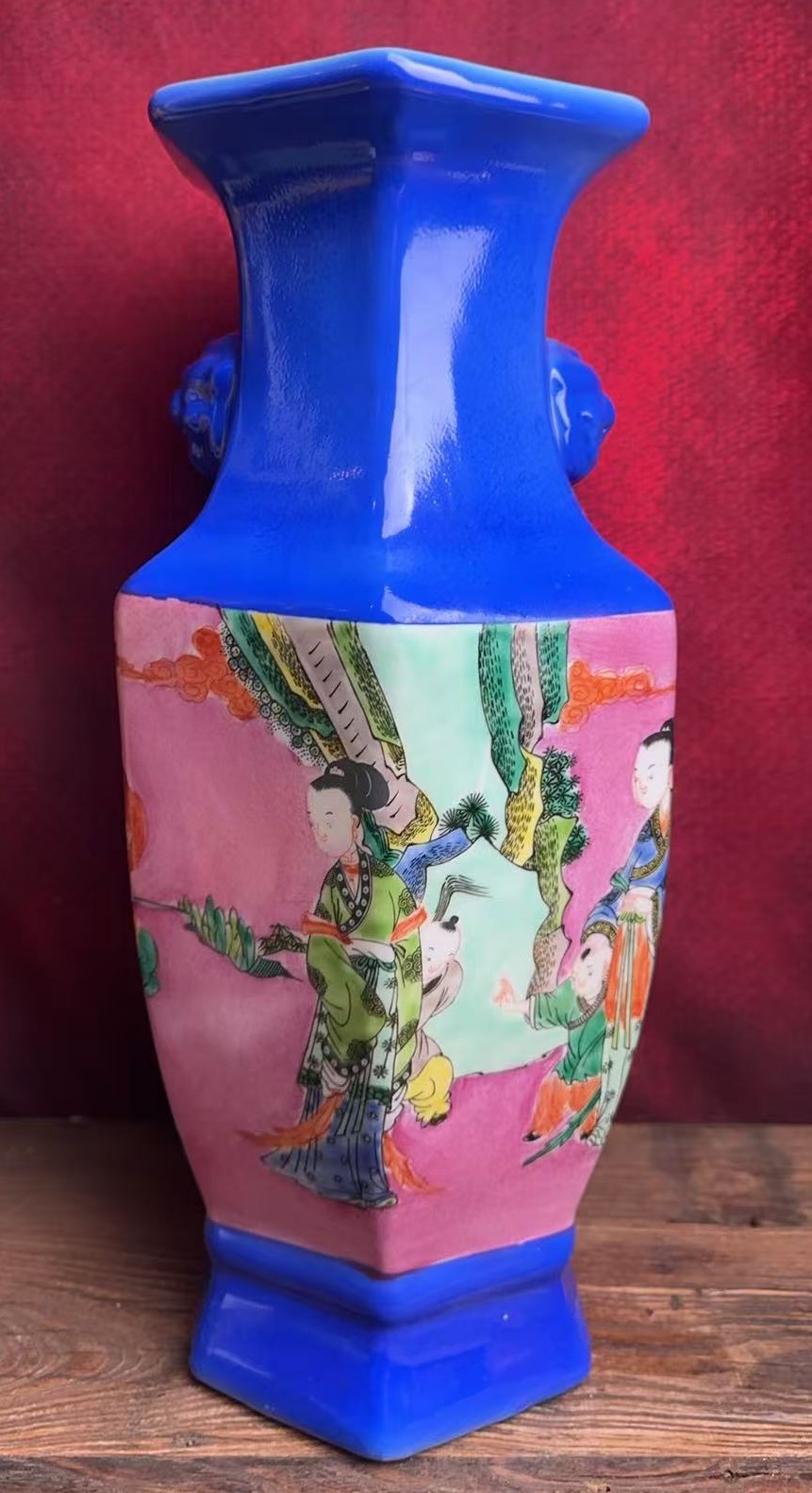 名称:清康熙蓝釉开窗五彩人物纹双耳四方尊