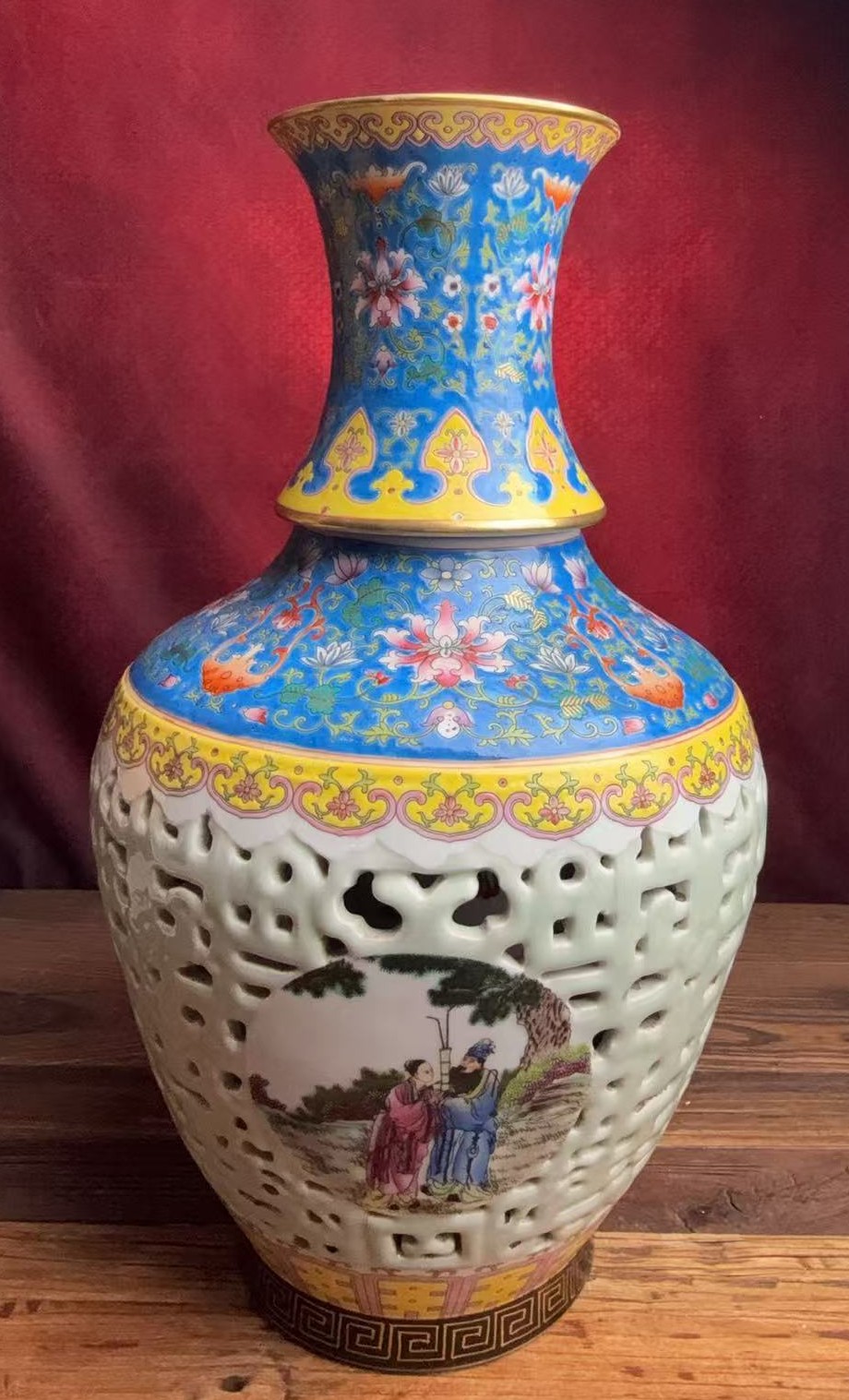 名称:清雍正洋彩镂雕开窗人物纹转心瓶