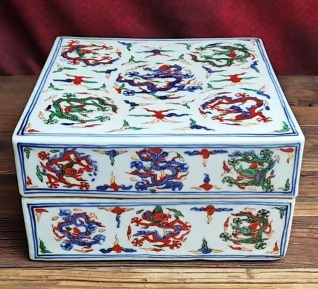 明嘉靖青花五彩龙纹四方盖盒