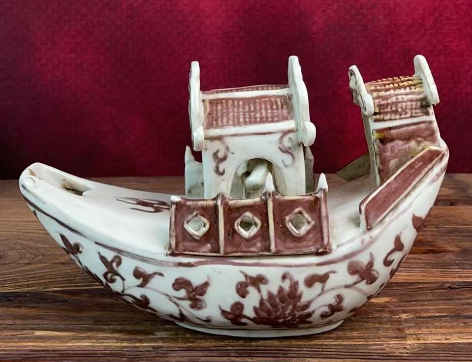 元釉里红缠枝莲纹船式砚滴
